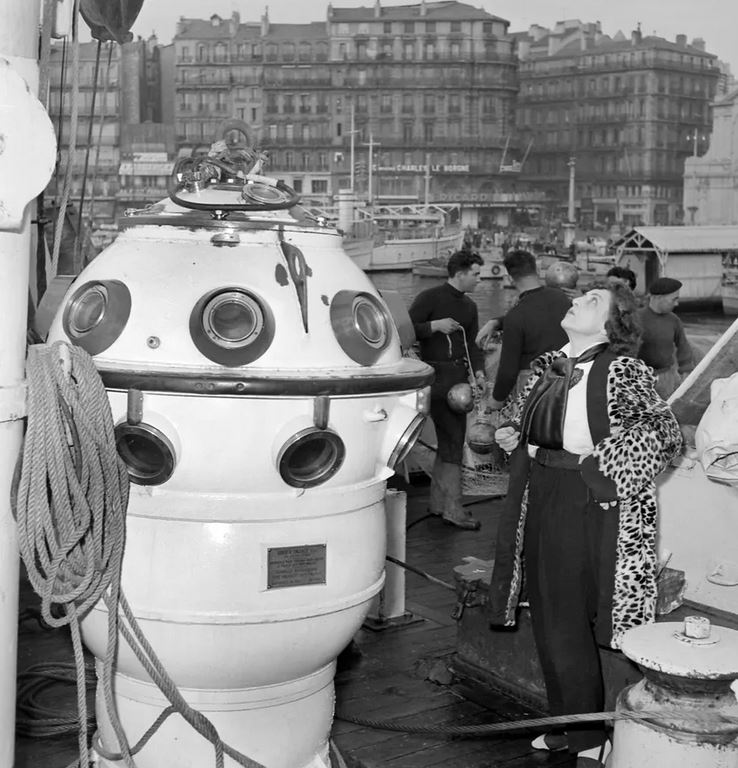 Anita Conti devant la tourelle de plongée dans laquelle elle est descendue à plus de 300 mètres de profondeur.